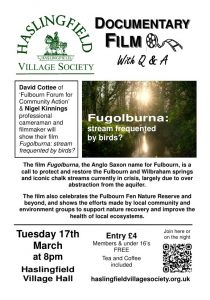 On Tuesday 17 March, 8.00 pm, Haslingfield Village Hall, David Cottee of ‘Fulbourn Forum for Community Action’ and Nigel Kinnings, professional cameraman and filmmaker will be showing their film, Fugolburna: stream frequented by birds? The film will be followed by a Q & A session More details about the film can be found here.
