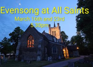 The All Saints’ Evensong Church Services for the rest of March will take place on 16th & 23 March at 5.30 pm.