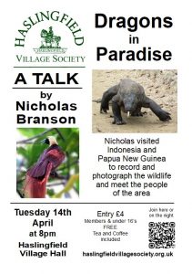 On Tuesday 14 April, Nicholas Branson will be giving a talk on Dragons In Paradise at 8.00 pm, at Haslingfield Village Hall. Please click here for more details.