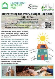 Free advice on everything from free DIY solutions to first steps to full home makeovers, plus meet some local champions who can help you find out where your home is losing heat! More details here. Book your free place here. Everyone is welcome – you don’t have to be a Haslingfield/Harlton resident.