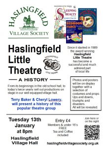 Next Tuesday, 13 January, Haslingfield Little Theatre will be presenting A History of Haslingfield Little Theatre at 8.00 pm, at Haslingfield Village Hall.